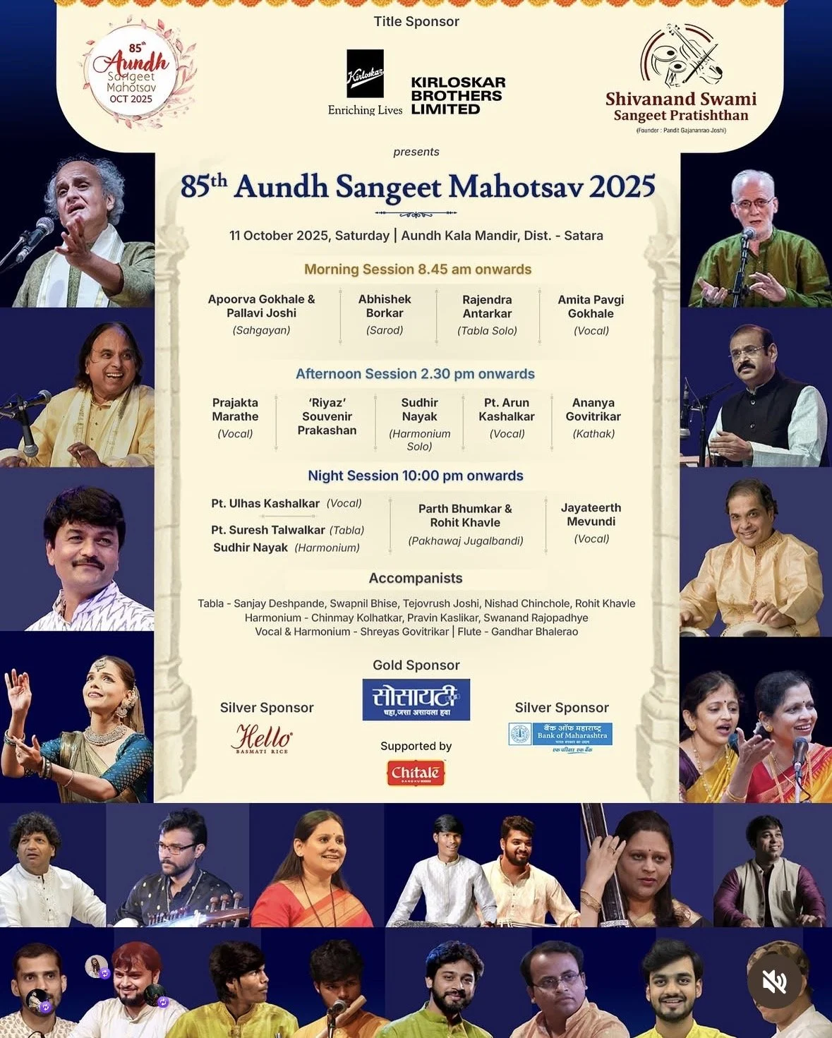 We are delighted to invite you to the 85th Aundh Sangeet Mahotsav 2025, a celebration of over eight decades of musical tradition and legacy. Gandhar Bhalerao will be accompanying the renowned Senior Kathak exponent Smt. Ananya Govitrikar, along with a talented ensemble of musicians, for an enchanting evening of classical music and Kathak. Experience the captivating blend of rhythm, melody, and movement, and let yourself be carried away by the magic of tradition at Aundh Kala Mandir, Aundh, Dist. Satara on 11th October 2025.